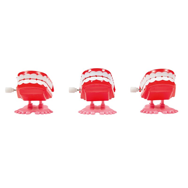 Kleine aufziehbare Gebisse, die auf Füßen montiert sind. Die aufgezogenen Gebisse klappern mit den Zähnen und hüpfen auf glatter Oberfläche.