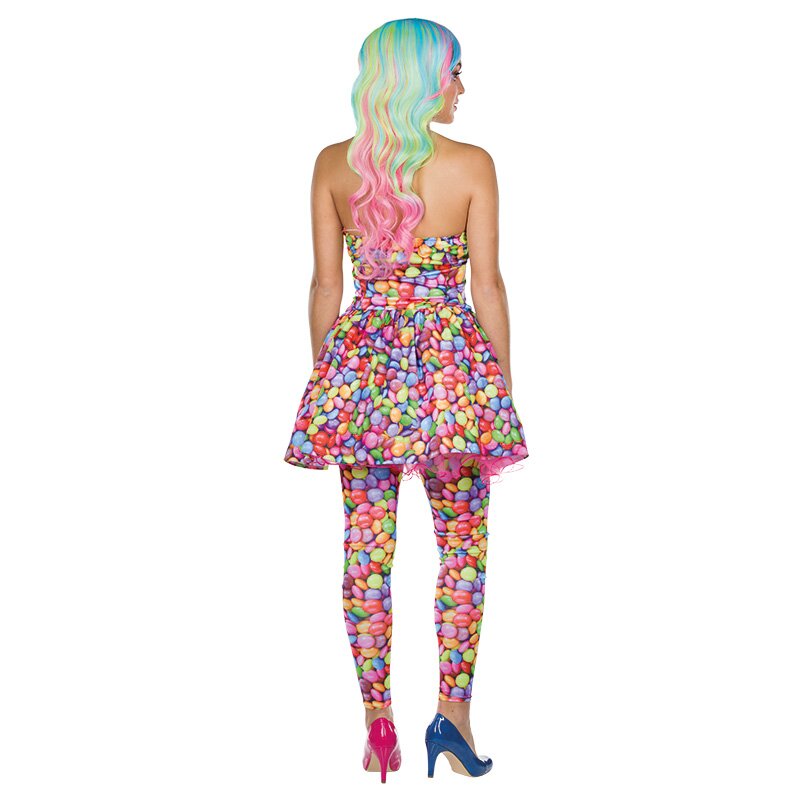 Schulterfreies Kleid mit Nackenträger, das mit bunten Schokolinsen bedruckt ist.