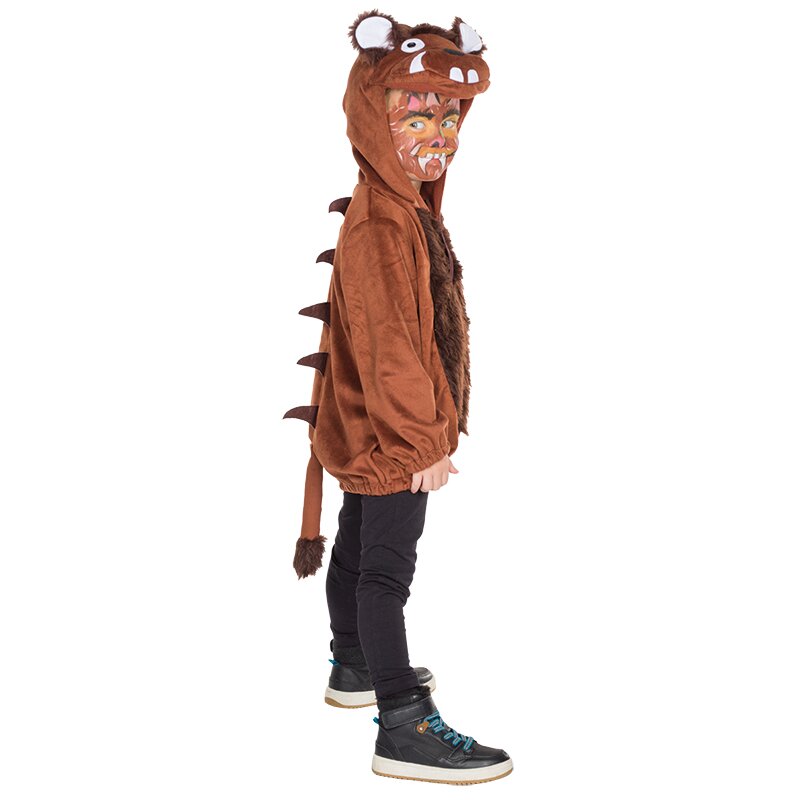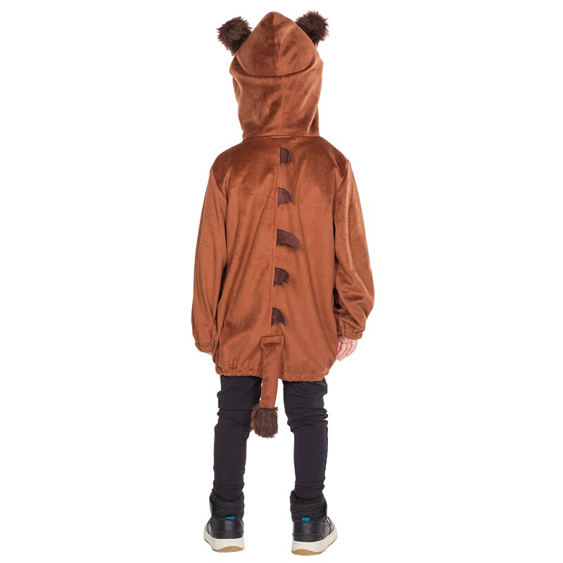 Kapuzenoberteil aus braunem Pannesamt mit einem braunen Fellbesatz auf der Brust. An der gepolsterten Kapuze sind zwei Ohren und ein Monstergesicht aufgenäht. Entlang des Rückens sind dunkelbraune Stacheln und ein Schwanz angebracht.