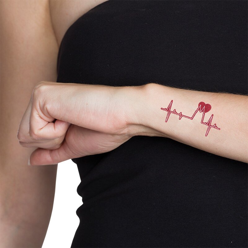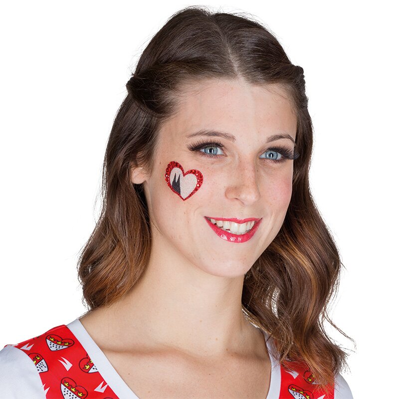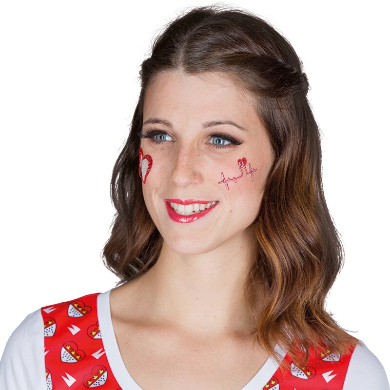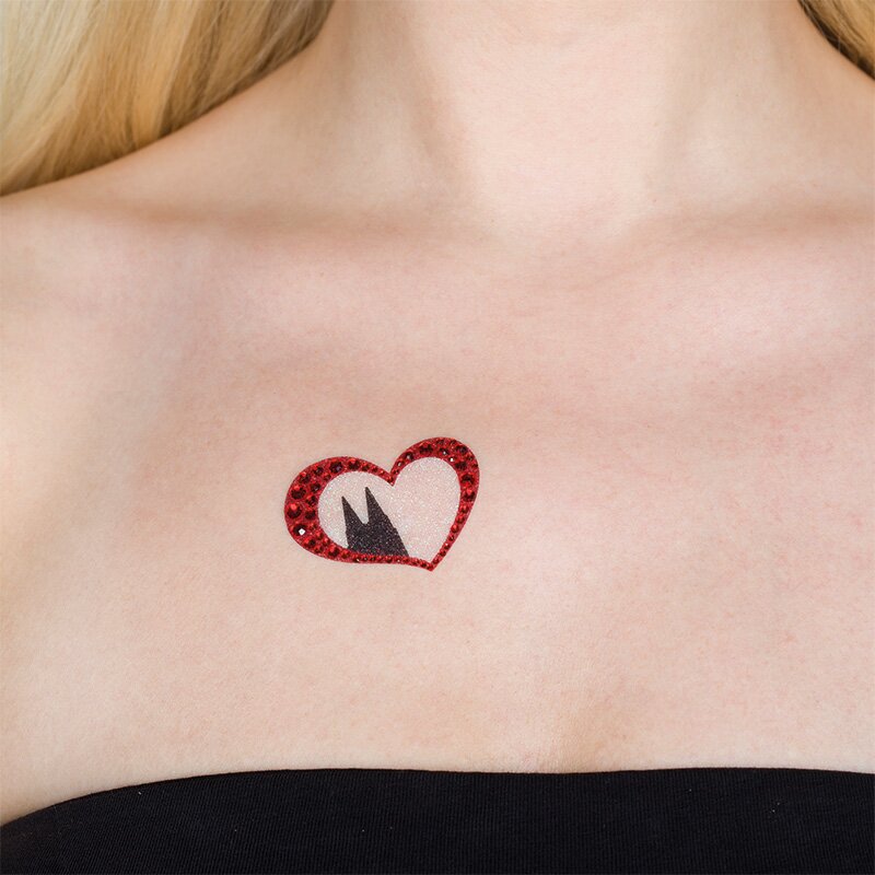 Hautaufkleber im Köln-Design mit zwei Motiven. Der Umriss eines Herzens in glitzerndem Rot mit der Shiloutte der Türme des Kölner Doms in der Mitte. Das zweite Motiv ist eine rot-glitzernde EKG-Linie, die in den Umrissen des Kölner Doms ausschlägt und mit einem Herzen verziert ist.