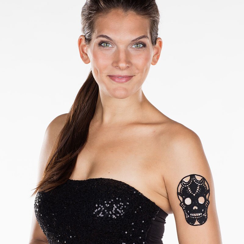 Selbstklebendes, wiederverwertbares Tattoo in Form eines Totenkopfes aus schwarzer Spitze.