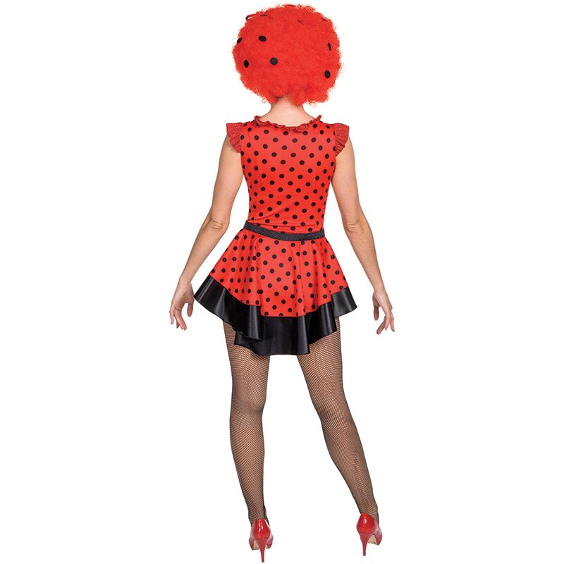 Ärmelloser roter Body mit schwarzen Punkten, der mit schwarzen Körbchen und am Auschnitt und den Schultern mit roter Rüschenborte verziert ist. Das nach hinten abfallende Schößchen hat ein breite schwarze Borte. Um die Taille ist ein schwarzes Band geschnürt.