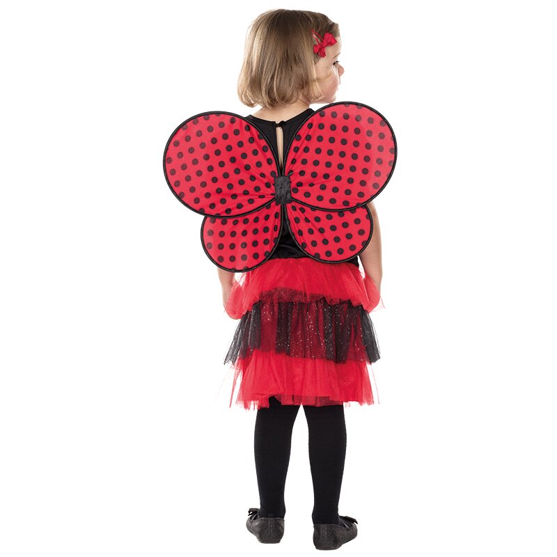 Schwarz-rotes Marienkäferkleid mit kurzen Puffärmeln. Der Rock besteht aus mehreren Lagen roter und schwarzer Tüllvolants. Inklusive Marienkäfer-Flügel.
