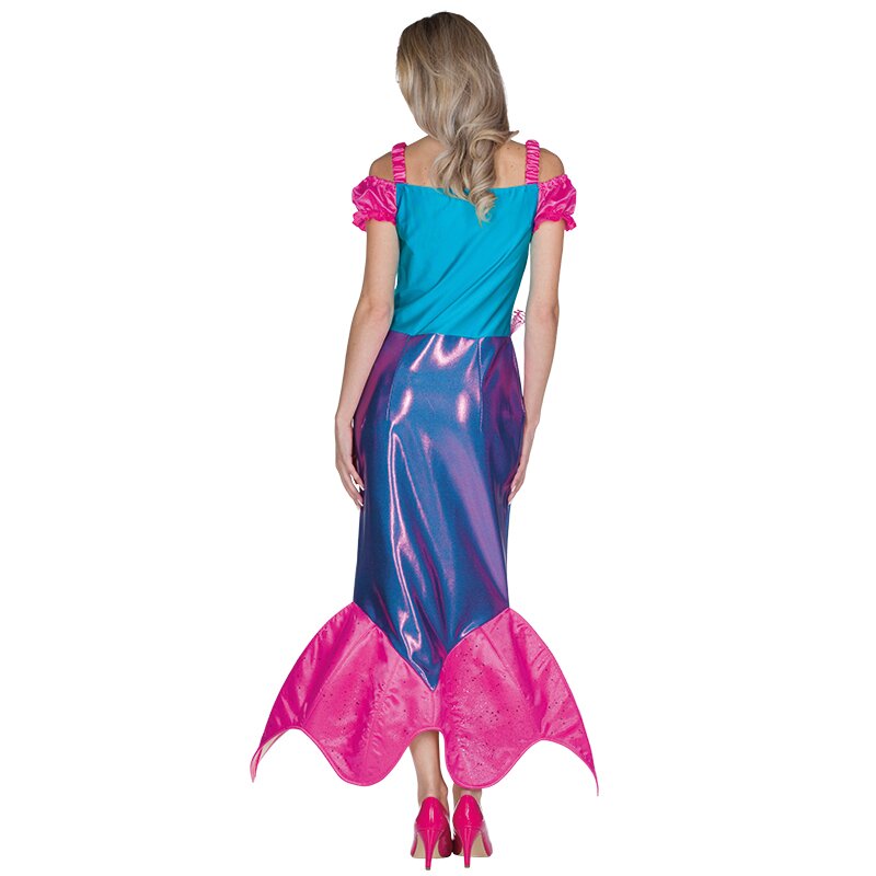 Enganliegendes Trägerkleid mit kurzen Puffärmeln, einem einem blauen Oberteil und einem enganliegenden, lila-schillernden Rock. Das Schößchen an der Taille ist aus glitzerndem Tüll gefertigt. Am Saum sind pinke Schwanzflossen angebracht. Das Kleid ist auf der Vorderseite mit Seestern- und Muschelaufnähern verziert. Inklusive eines dekorierten Haarreifs.