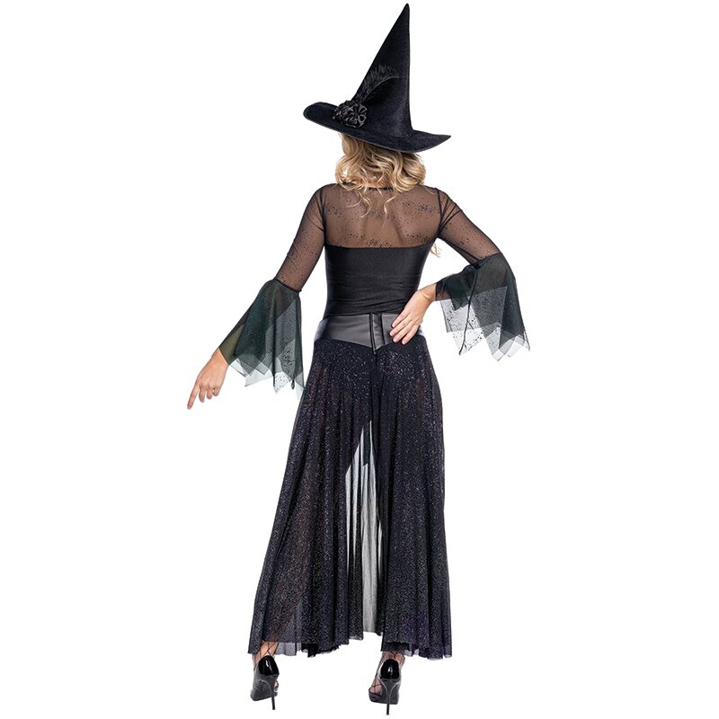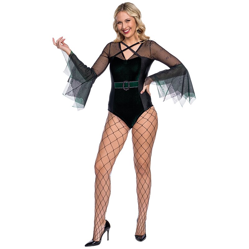 Schwarzer Body mit Zierschnürung am Ausschnitt sowie Volantärmeln aus schwarzem Tüllstoff. An der Taille ist ein dunkelgrünes Zierband mit Ornamentschnalle befestigt.