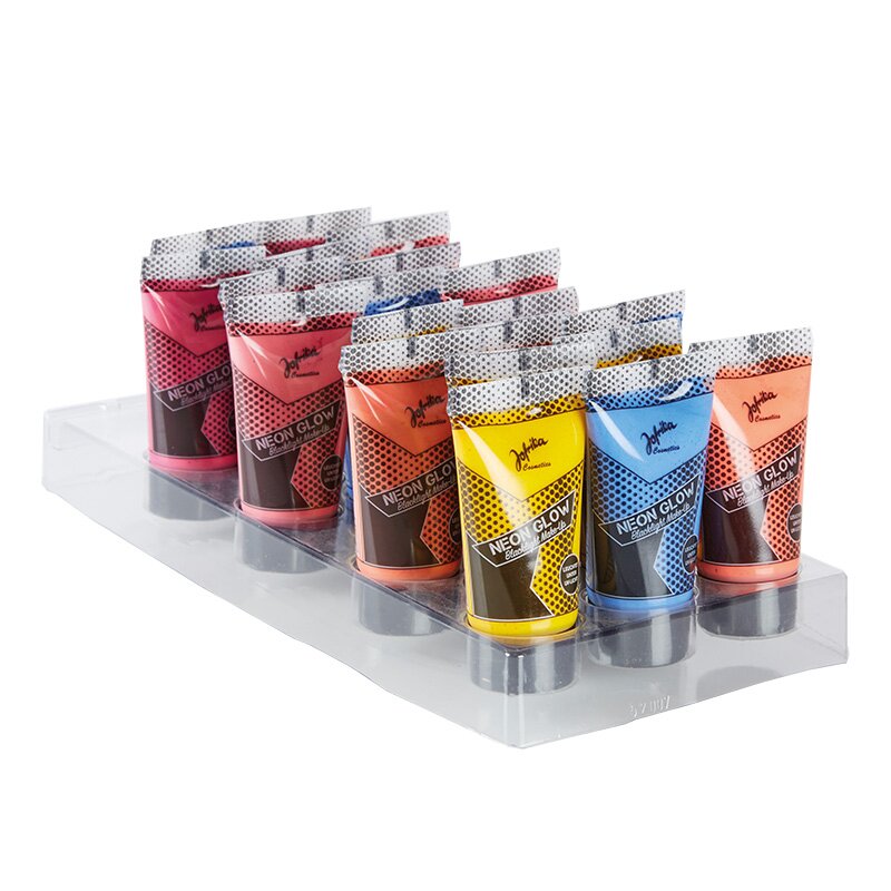 20er-Display mit Make-up in fünf verschiedenen Neonfarben, die unter Schwarzlicht leuchten.