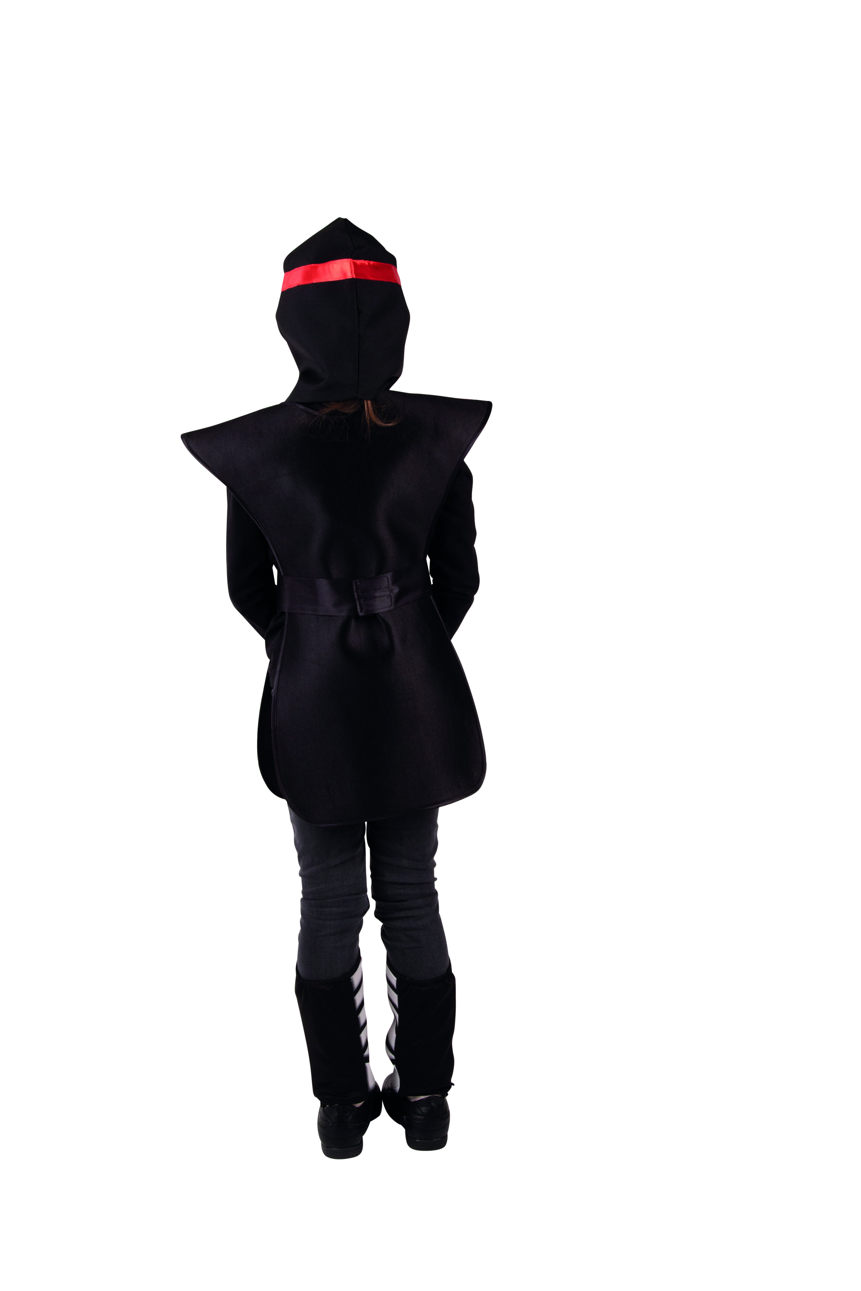 Wattierte, leicht metallisch schimmernde, seitlich offene Ninja-Robe mit passenden Beinstulpen, einem schwarz mit silbernen Symbolen bedruckten Stoffgürtel und einer Haube. Die schwarze Haube hat ein rotes, aufgenähtes Satinband als Verzierung und lässt sich seitlich im Kinnbereich mit einem Klettstreifen öffnen und schließen. Die Rückenpartie ist uni schwarz.