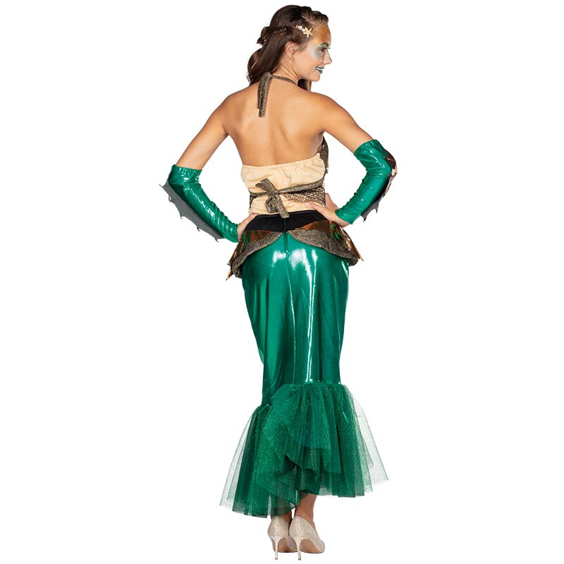 Ärmelloses hautfarbenes Oberteil mit Nackenträger, das mit Glitzerstoff, Körbchen aus silbernen Muschelschalen, Perlenketten und Netzstoff dekoriert ist. Der enganliegende Rock und die Armstulpen sind aus grünem Glanzstoff gefertigt. Der Rock hat ein Schößchen an der Taille, und am Saum sind Schwanzflossen aus grünem Tüll angebracht. Die Armstulpen sind mit goldenen Flossen verziert.