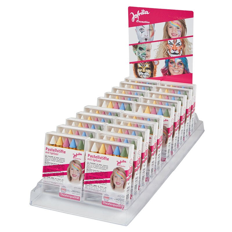 20er-Display mit fünf Schminkstifte in Pastellfarben (Gelb, Rosa, Blau, Grün) und Weiß; inklusive Spitzer. Die Farben sind mit Wasser und Seife abwaschbar.