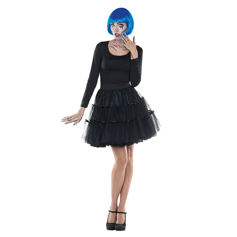 Knielanger Petticoat aus schwarzem Tüllstoff und einem breiten Gummizug an der Taille.
