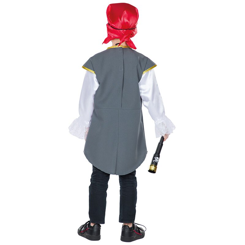 Zweiteiliges Kinder-Piratenkostüm: Das Oberteil ist eine Kombination aus Rüschenhemd und grauem Frack, eine angenähte rote Borte deutet einen Gürtel an. Dazu passend ein rotes Kopftuch mit Totenschädel-Aufdruck (ohne Augenklappe).