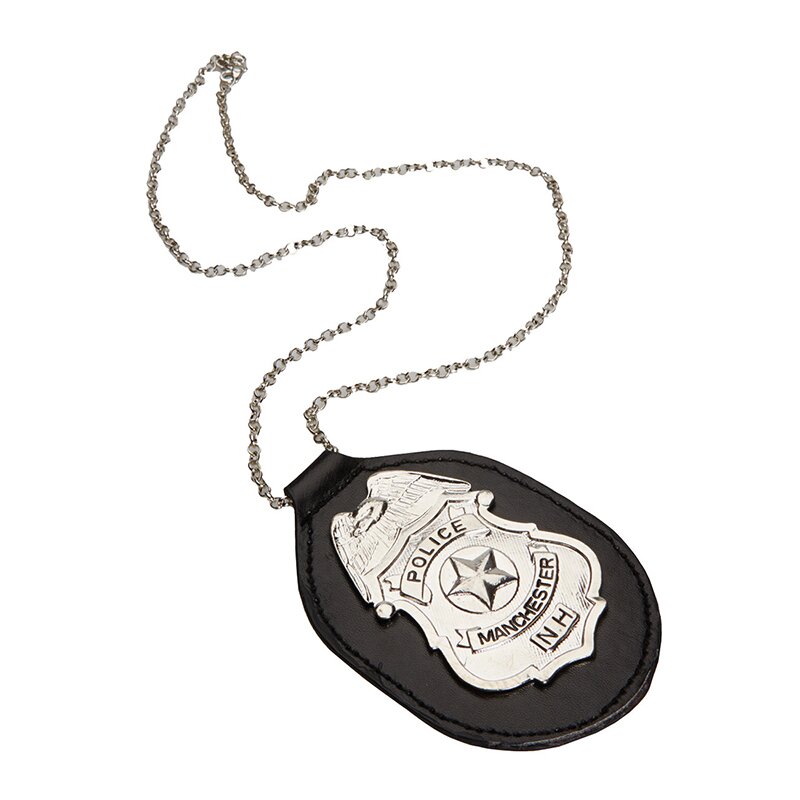 Gliederkette mit einem ovalen Anhänger aus schwarzem Lederimitat. Auf dem Anhänger ist eine silberne Dienstmarke im Stil der amerikanischen Polizei angebracht.