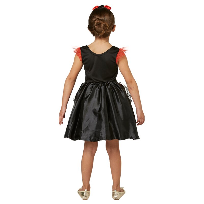 Kleid in einem Design aus aufgedruckten Totenköpfen und roten Rosen. Am Ausschnitt und Saum ist eine rote Rüschenborte angebracht. Das Schößchen aus schwarzer Spitze ist mit roten Stoffrosen verziert. Inklusive eines Haarreifs mit Dekorosen.