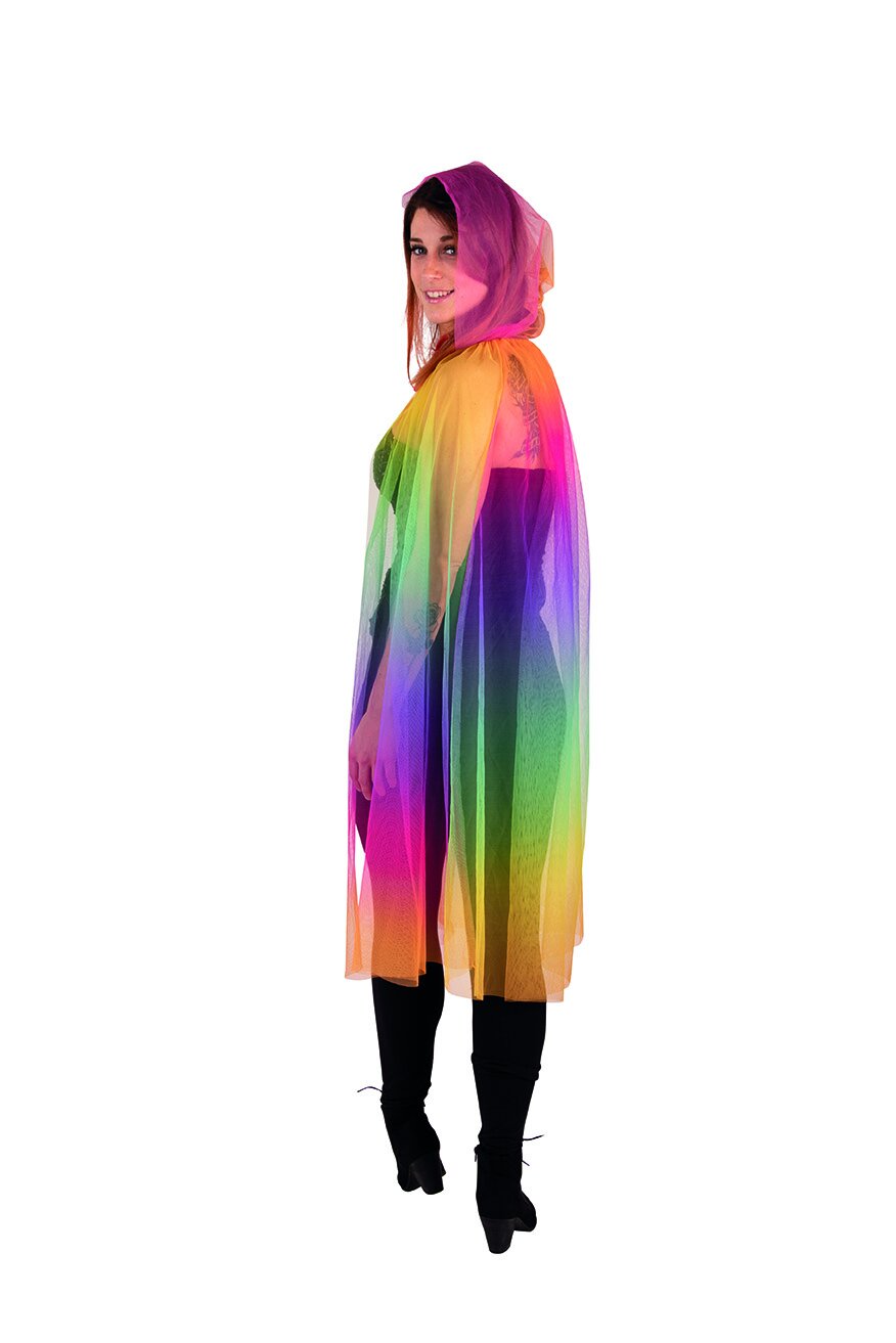 Filgranes Tüll-Cape mit dem Farbverlauf eines Regenbogens. Vorn kann das Cape mit einer roten Schlaufe gebunden werden, die spitz zulaufende Kapuze fällt locker und elegant aufs Haar.