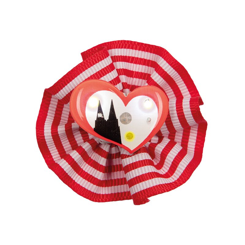 Ring mit einer rot-weiß gestreiften Stoffrosette, die mit einem blinkenden Herz verziert ist. Auf dem Herz ist die Silhouette des Kölner Doms abgebildet. Batterien sind beinhaltet.