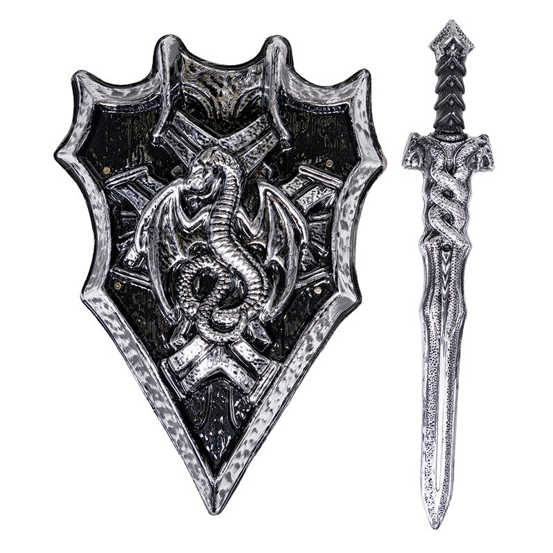Schwert mit einem aufgeformten Drachenemblem. Das Schwert ist vielfältig verziert und kann auf der Vorderseite des Schildes eingesteckt werden.