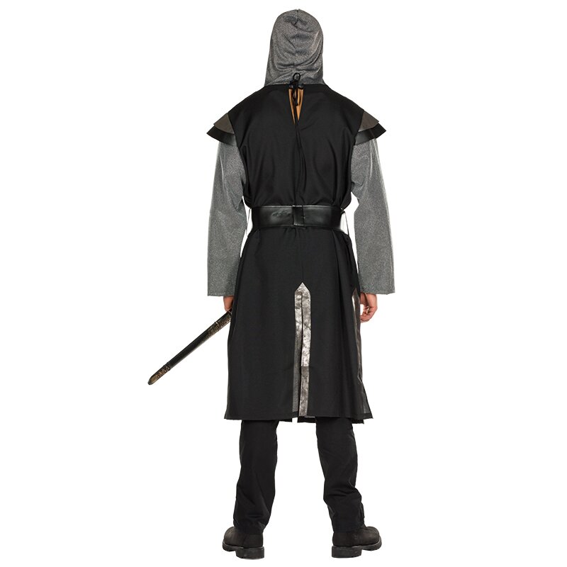 Schwarzes Ritter-Oberteil mit Schulterklappen und einem großen silbernen Adler-Emblem auf der Brust. Die langen Ärmel sowie die separate Mütze sind in Kettenhemdoptik gehalten. Inklusive eines breiten schwarze Gürtels mit Zierschnalle.