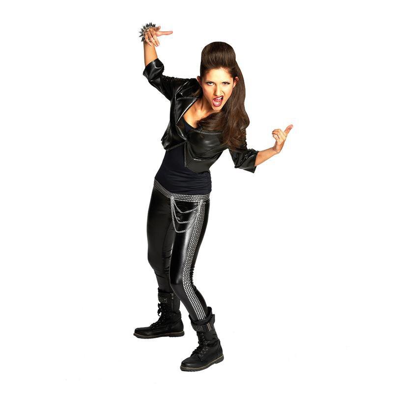 Rockerkostüm aus Lederimitat, bestehend aus einer nietenbesetzten Bolerojacke mit einem als Taschenattrappe aufgenähtem Reißverschluss. Die Hose hat entlang der Hosenbeine einen Einsatz mit Silberaufdruck hat. Inklusive eines passenden Gürtels, der mit Ketten dekoriert ist.