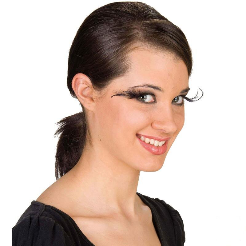 Extravagante Wimpern mit außergewöhnlich langen schwarzen Federn. Inklusive Wimpernkleber.