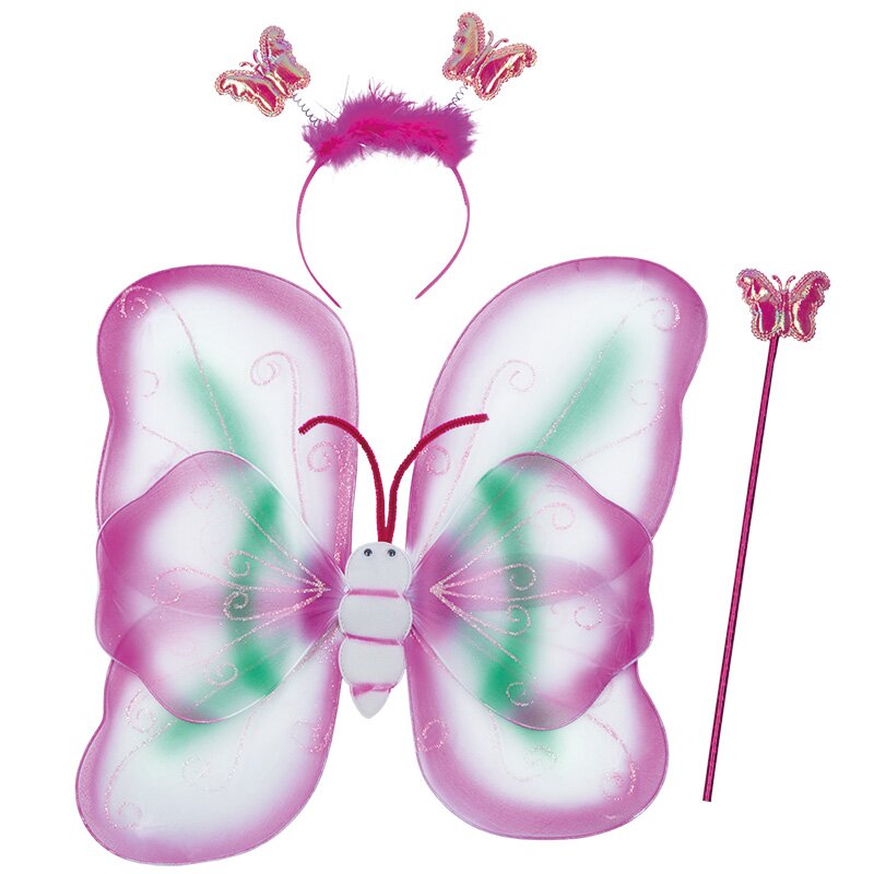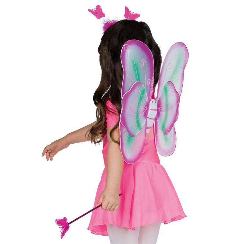 Dreiteiliges Schmetterling-Set für Kinder. Das Set besteht aus einem plüschbesetzten Haarreif mit Schmetterlingensfühlern sowie einem pinken Stab, der mit einem Schmetterling und silbernen Bändern geschmückt ist. Die transparenten Flügel sind in Lila und Grün sowie mit einem rosanen Glitzermuster bedruckt und in der Mitte mit einem Schmetterlingskörper dekoriert.