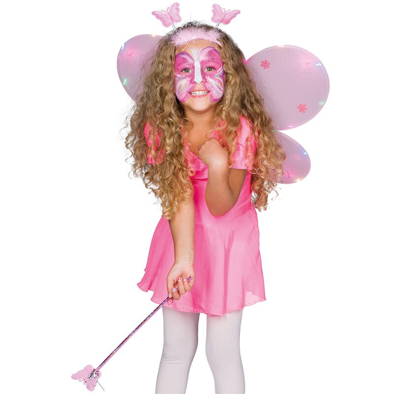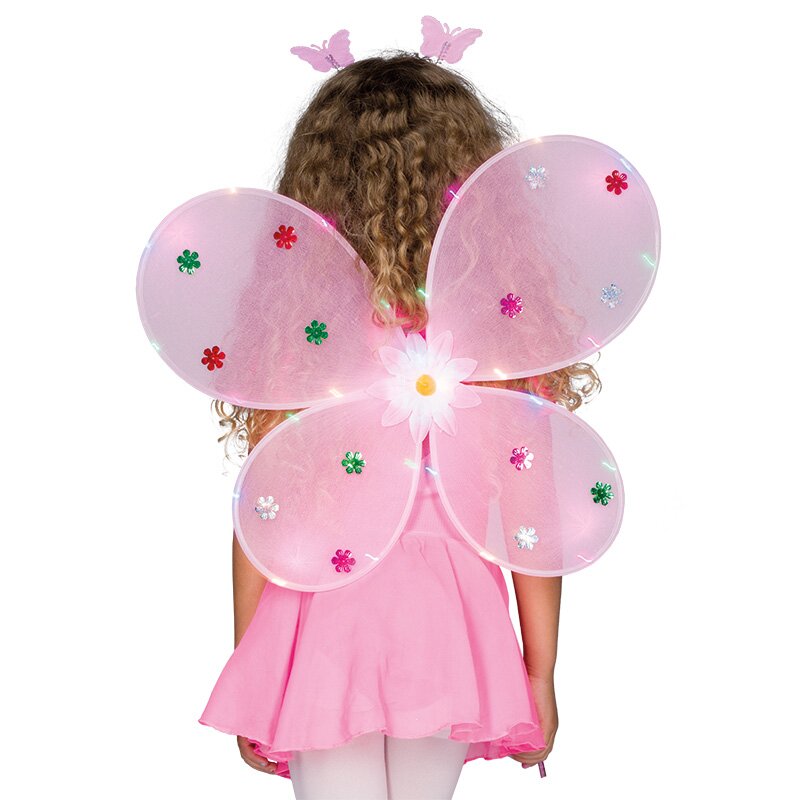 Rosane Schmetterlingsflügel, die mit bunten Dekoblüten verziert sind. Am Rand der Flügel verläuft ein Schlauch mit kleinen LED-Lichtern. Inklusive eines Haarreifs mit Flitterbesatz und eines glänzenden Stabes. Auf den Fühlern des Haarreifs und auf dem Stab sind Schmetterlinge angebracht. Batterien sind beinhaltet.