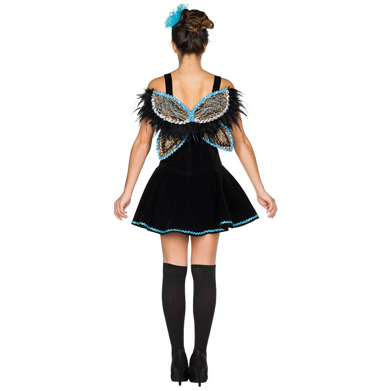 Schulterfreies Trägerkleid aus schwarzem Pannesamt, das mit blauer Zierborte verziert ist. Am Rücken sind Schmetterlingsflügel aus gemustertem Stoff befestigt, die aufwendig mit Paillettenborte und Federn verziert sind.
