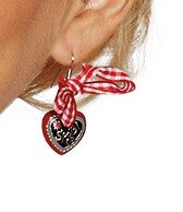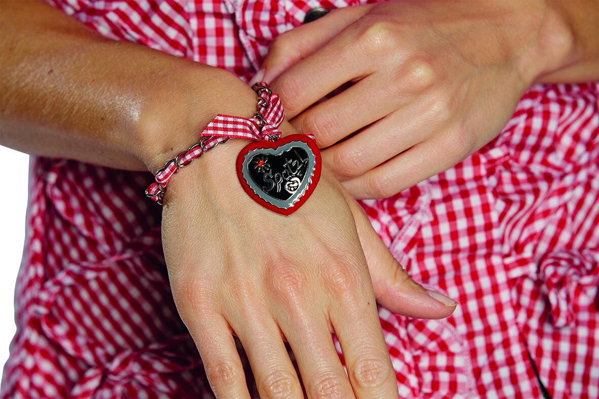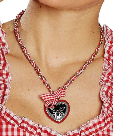 3teiliges Schmuckset im bayrischen Stil. Die Halskette, das Armband und die Ohrringe sind mit rot-weißen Stoffbändern verwoben und mit einer Schleife verziert. Die Anhänger sind in Form von kleinen Lebkuchenherzen gestaltet.