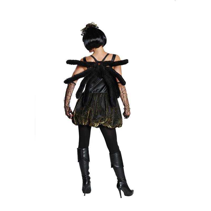Schwarzes Trägerkleid mit Plüscheinsatz auf der Brust und einem Pannesamtstück am Rücken für mehr Elastizität. An den vorderen Seiten ist ein gelber Stoff eingesetzt, der mit schwarzem Tüll überzogen ist, welcher Spinnennetze aufgedruckt hat. Der Ballonrock ist auch mit schwarzem Tüll überzogen, jedoch sind die aufgedruckten Netze goldfarbend und dichter.