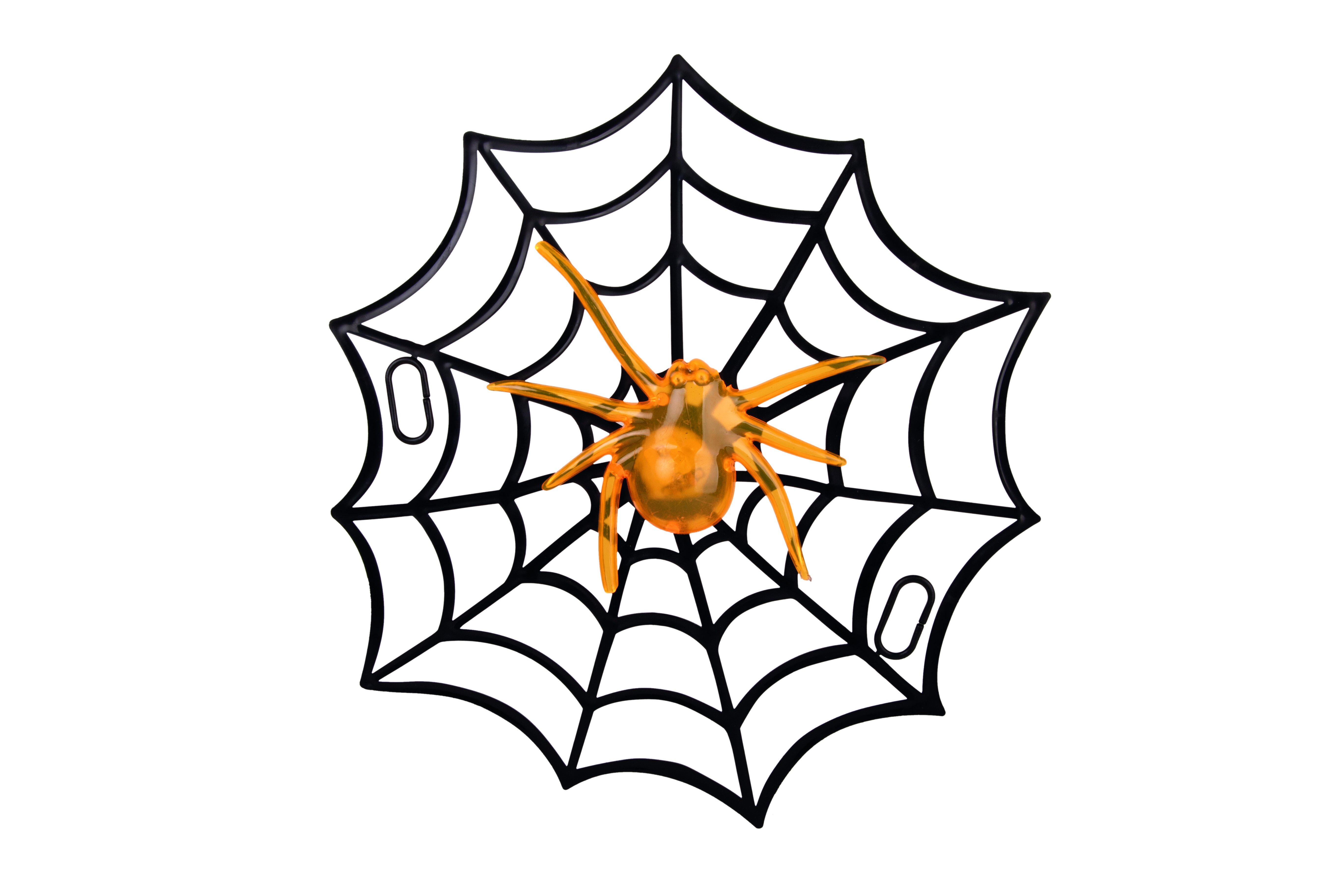 Schwarzes Spinnennetz aus Kunststoff mit einem Durchmesser von ca. 33 cm. Im Spinnennetz ist eine Spinne in orange mit LED Effekt befestigt. Die Halloween Dekoration kann beispielsweise mit Hilfe der beigefügten Kunststoffringe aufgehängt werden.