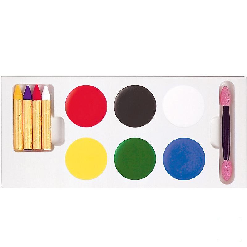 6 Farben Theaterschminke (30 g), 4 Schminkstifte (7 g) und einen Applikator.