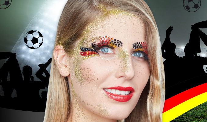 Kleines Display mit 10 Sets glänzender Wimpern in den deutschen Nationalfarben, sowie Wimpernkleber.