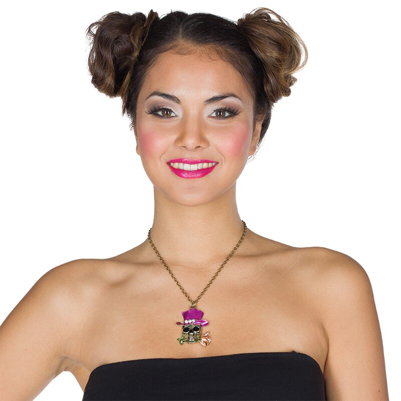 Halskette mit einem Totenkopfanhänger. Der Schädel trägt einen lilanen Zylinder und hat eine goldene Rose zwischen den Zähnen. Zylinder und Rose sind mit Strasssteinen besetzt.