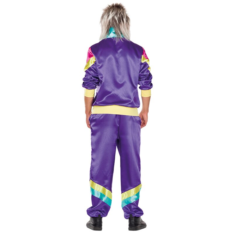 Lilaner Trainingsanzug im Stil der 80er und 90er Jahre. Der Anzug hat Einsätzen in kräftigen Farben. Die Jacke wird mit einem Reißverschluss geschlossen.