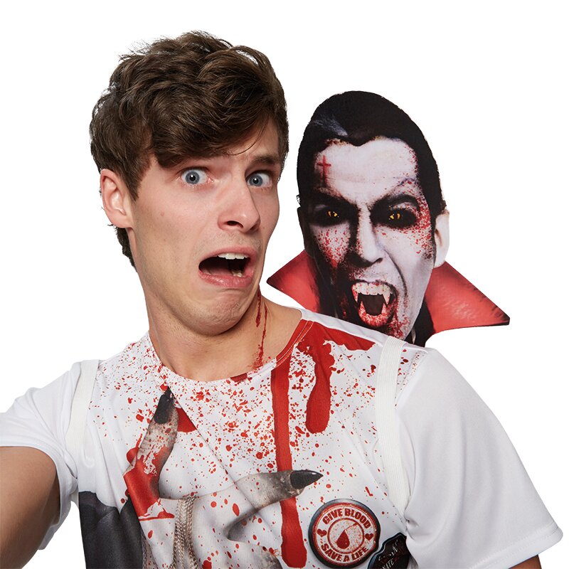 Weißes T-Shirt mit aufgedruckten Vampirarmen und Blutspritzern. An der Schulter wird die Pappattrappe eines Dracula-Kopfes befestigt.