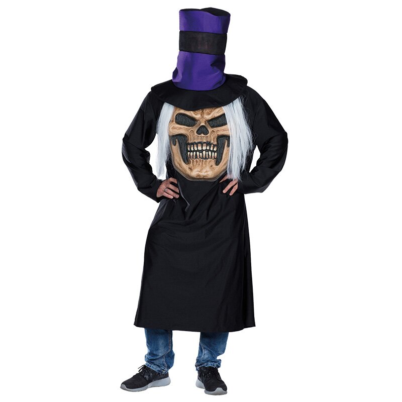 Schwarze Robe mit einem auf der Brust aufgenähtem Totenschädel. Dazu gehört ein enormer schwarz-lilafarbener Stoffzylinder mit angenähten weißen Haaren, der über dem Gesicht getragen wird und ein verdecktes Sichtfenster hat.