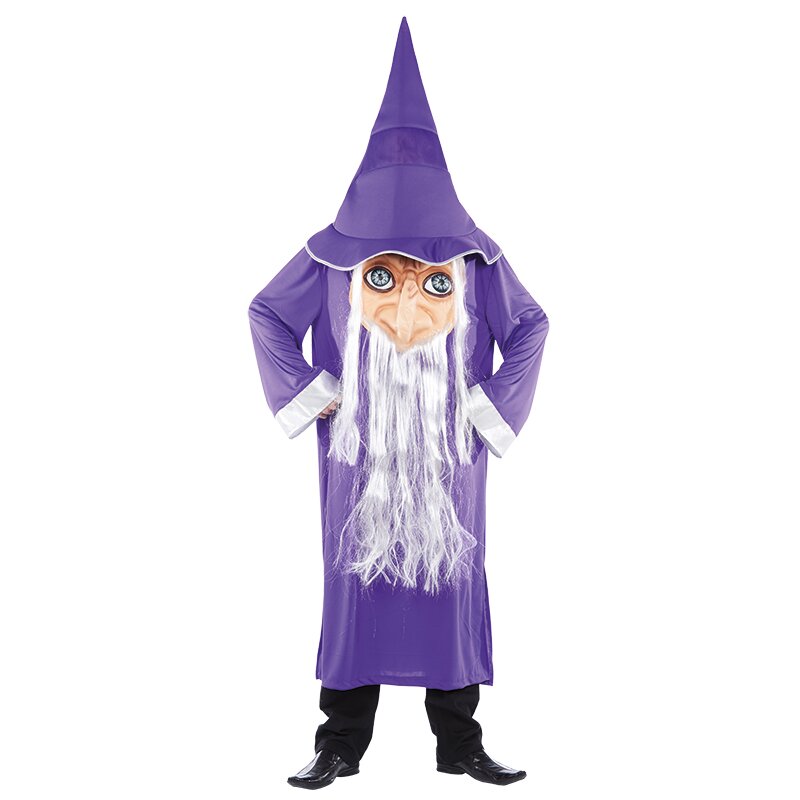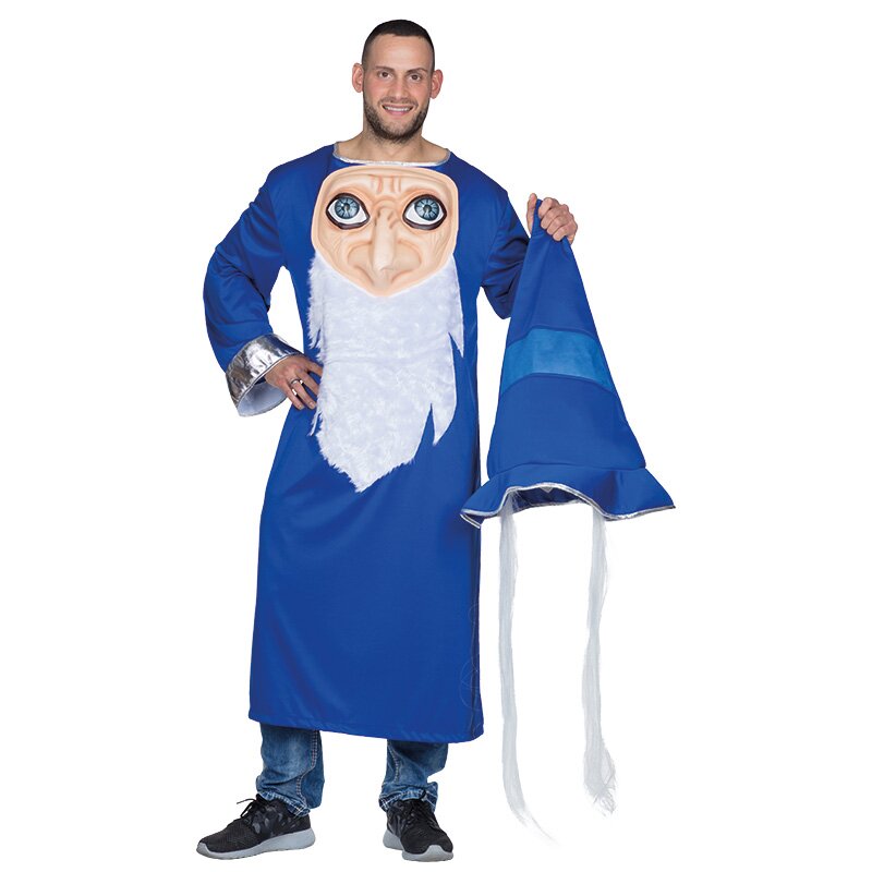 Blaue Robe mit einem auf der Brust aufgenähtem Gesicht, an dem ein langer Bart aus weißem Plüsch befestigt ist. Dazu gehört ein enormer blauer Zaubererhut mit angenähten weißen Haaren, der über dem Gesicht getragen wird und ein verdecktes Sichtfenster hat.