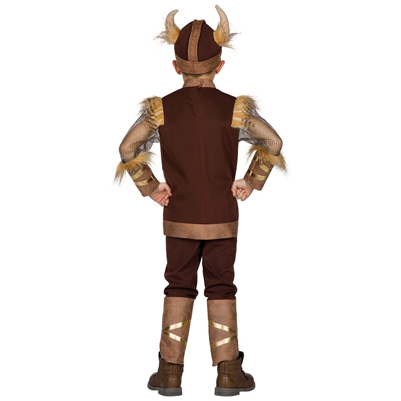 Kostüm bestehend aus einem braunen Oberteil und Hose, die mit Lederimitat besetzt sind. Die Ärmel in Kettenhemdoptik sind mit Fell besetzt. Das Oberteil ist mit goldenen Ornamenten dekoriert. Inklusive eines Wikingerhelms aus Stoff, an dem wattierte Hörner und ein Schmuckornament befestigt sind.