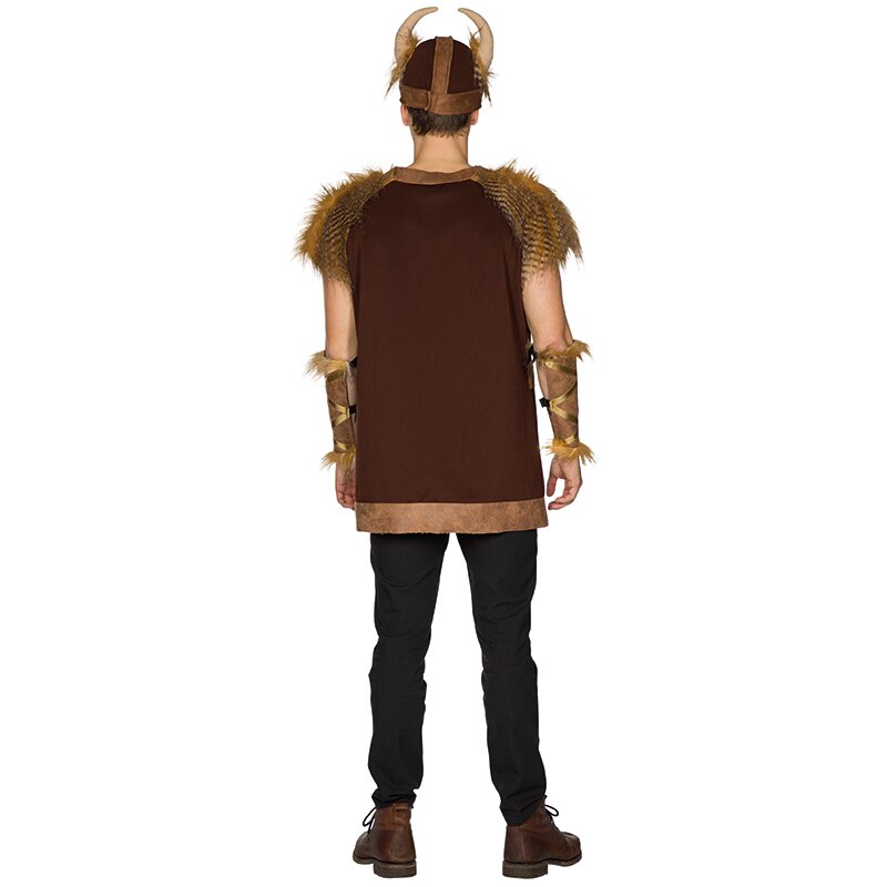 Kurzärmliges braunes Oberteil, das mit Lederimitat und Fell besetzt sowie mit goldenen Ornamenten dekoriert ist. Inklusive zweier Armstulpen und eines Wikingerhelms aus Stoff, an dem wattierte Hörner und ein Schmuckornament befestigt sind.