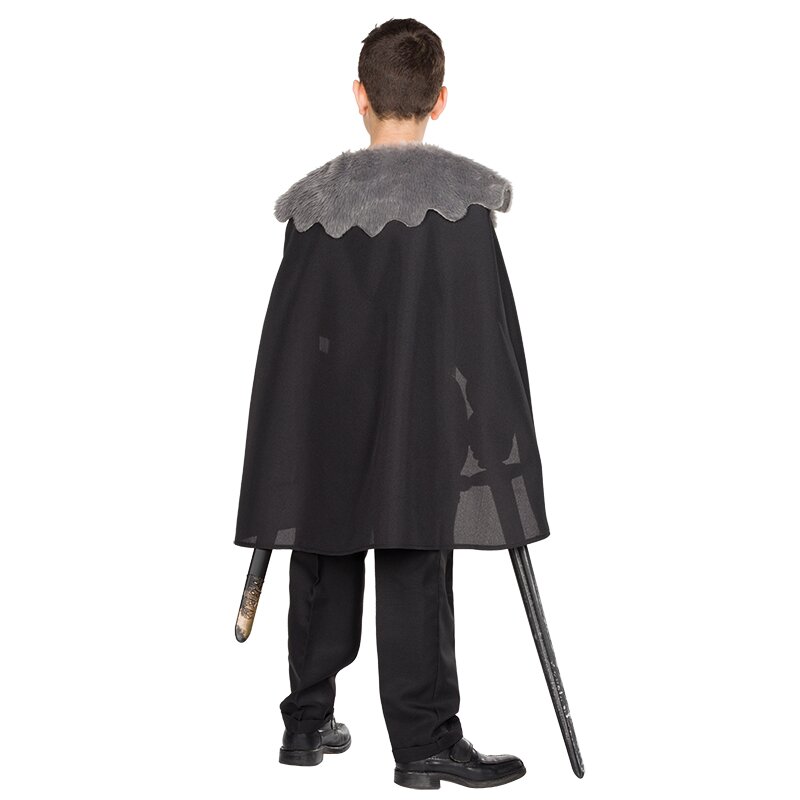 Langärmliges dunkelbraunes Oberteil mit angenähten schwarzen Rüstungsteilen und einem Gürtel in Lederoptik. Inklusive eines schwarzen Capes, das mit einem breiten grauen Fellkragen besetzt ist.