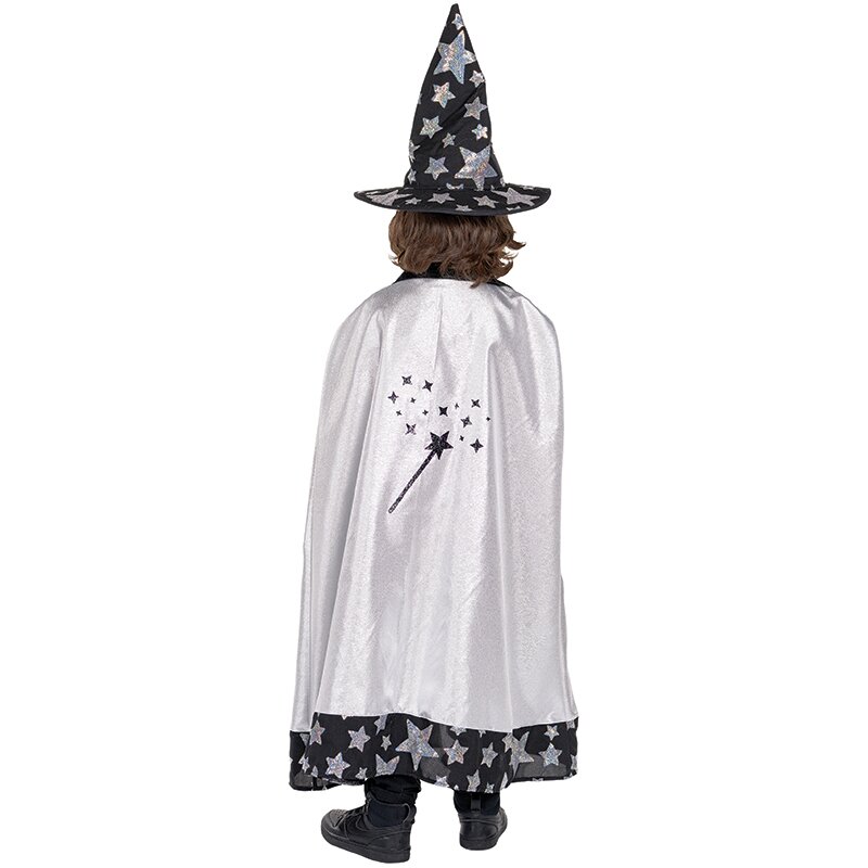Langes weißes Cape mit einem schwarzen Kragen und breiten schwarzen Säumen, die mit silber-glitzernden Sternen bedruckt sind. Auf dem Rücken ist ein Motiv mit Zauberstab und Sternen aufgedruckt. Inklusive eines passenden Spitzhutes.