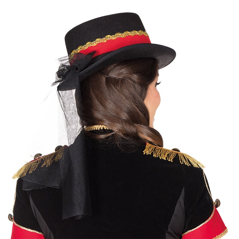 Schwarzer Zylinder, der mit einem roten Hutband und goldener Zierborte dekoriert ist. An der Rückseite ist eine schwarze Tüllschleife mit langen Bändern angebracht.