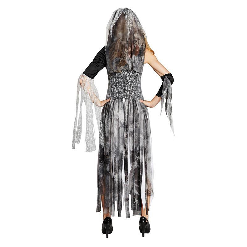 Zombiekleid mit schwarzem Oberteil, das mit weißem Spitzenstoff drapiert ist. Das Kleid hat auf einer Seiten einen halblangen Ärmel mit langer weißer Spitzenborte. Die andere Seite ist ärmellos, hat aber einen Armstulpen. Der Halbärmel sowie die Taille sind aus schwarzem Stoff, der mit weißen Knochen bedruckt ist. Über dem stark gezackten, weißen Unterrock ist ein in Fransen geschnittener, grau-schwarzer Rock angebracht. Das Kleid kommt mit einem Haarreif, der einen Schleier aus Spitze hat.