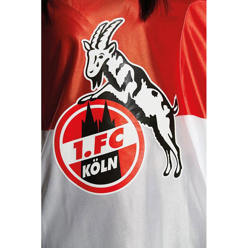 Ein Flaggenkleid, das im oberen Teil rot und im unteren weiß ist. Der rechte Ärmel ist kurz, wohingegen der linke in die Flagge über geht. Auf der Vorderseite ist ein großes 1.FC Köln Logo aufgedruckt.