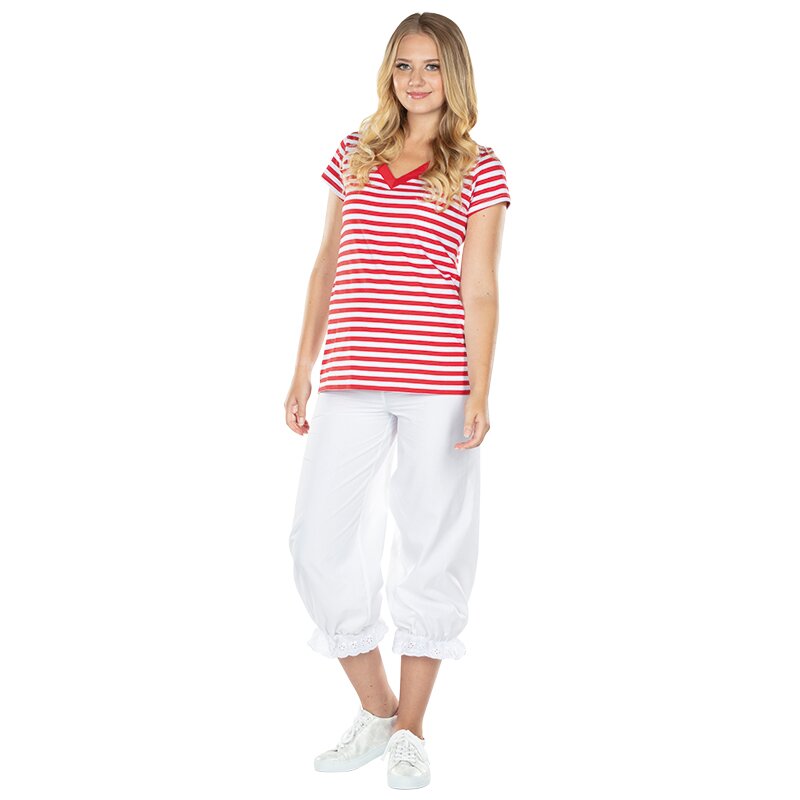 Weiße 3/4- Hose mit Gummizug an der Taille und den Beinenden. Der Saum der Hosenbeine läuft in Spitze aus.