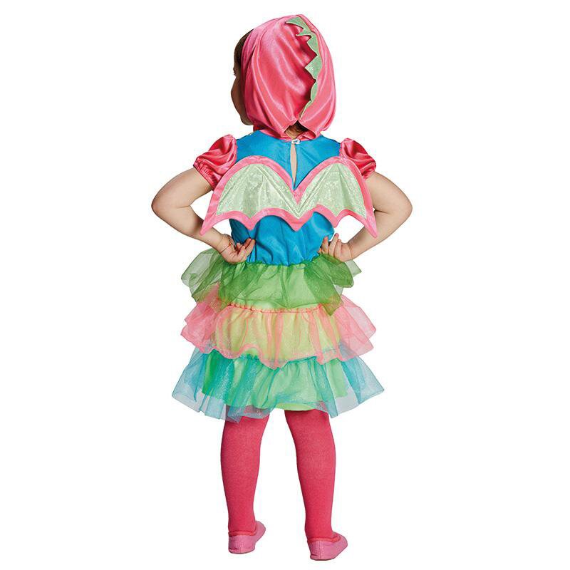 Buntes Kleid mit kurzen Puffärmeln und am Rücken befestigten Flügeln. Die Kapuze ist mit einem Plattenkamm und der Rock mit bunten Tüllvolants verziert. Ein kleiner Drache schmückt das Kleid.