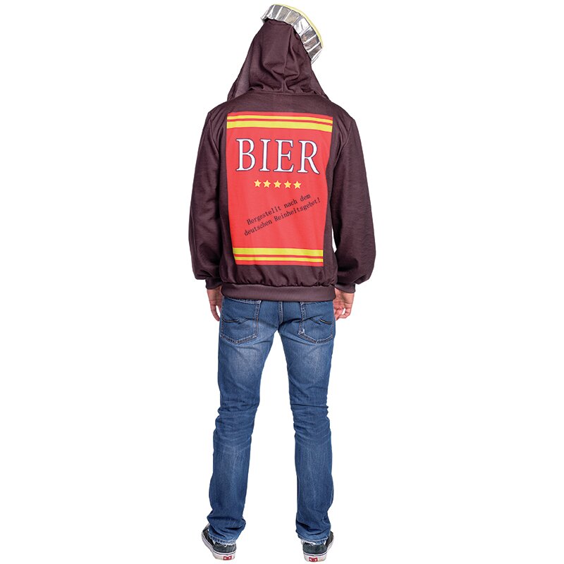 Braunes Kapuzenoberteil, das auf der Vorder- und Rückseite mit Flaschenetiketten für Bier dekoriert ist. Auf der Kapuze ist ein Kronkorken befestigt.