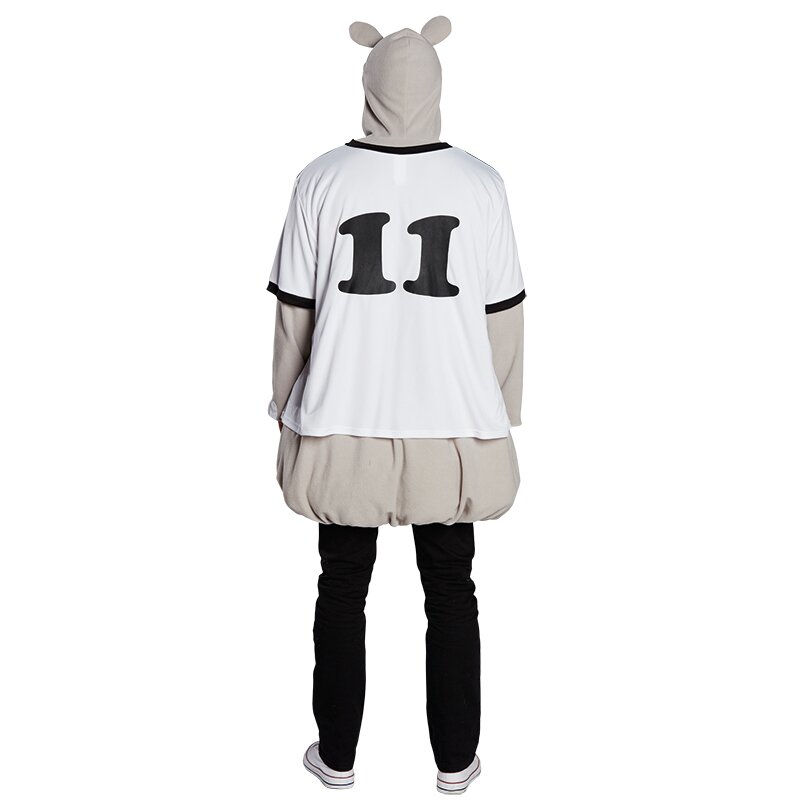 Langes, graues Nilpferdoberteil im Fußball-Design mit wattierter Hüfte. Auf der angenähten, skulptierten Kapuze sind Ohren und ein Nashorn angebracht sowie Augen aufgenäht. Die Säume der langen Ärmel sind mit weißen Zehennägeln verziert. Inklusive eines weißen Fußballtrikots mit der Nummer 11.