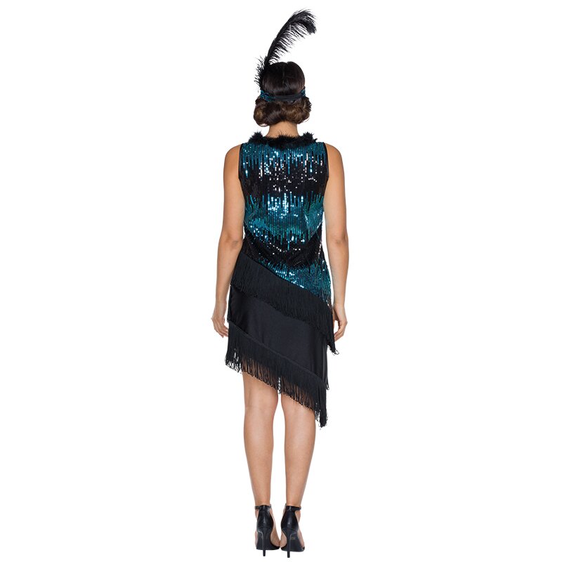 Schwarzes Charlestonkleid, das auf der Vorderseite mit blau-schimmernden und schwarzen Pailletten und am Ausschnitt mit Plüsch besetzt ist. Am Rock sind mehrere Reihen langer schwarzer Fransen angebracht. Ein Ornament mit einem großen Schmuckstein verziert die Taille. Inklusive eines paillettenbesetzten Stirnbands mit Feder.