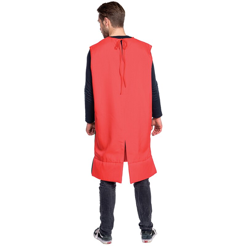 Lange, ärmellose Tunika in Rot und Grün in Form einer Kartoffelchips-Tüte. Auf der Vorderseite sind Werbetext sowie Chips und Paprikas aufgedruckt.