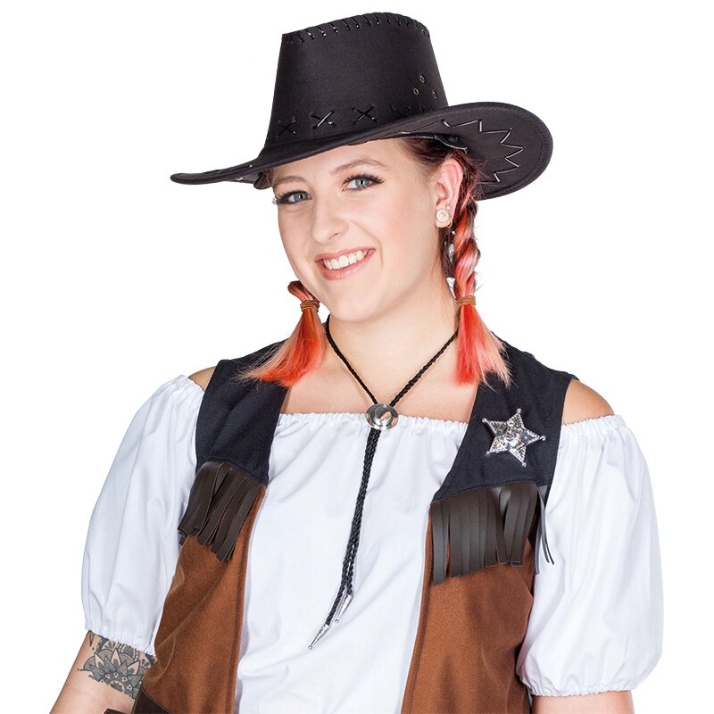 Halskette aus schwarzer Kordel, die mit einem silbernen Miniatur-Cowboyhut zusammengehalten wird. An den Enden der Schnur sind silberne Spitzen angebracht.